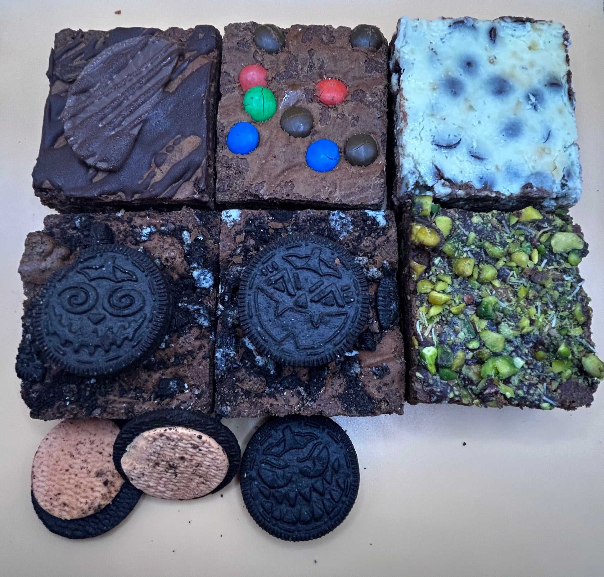 A box of 6 - 1 - Cheesecake Brownie, 1 - Dubai Brownie, 1 - M&M Brownie, 1 - Orange Brownie and 2 - Special Edition Spooky Oreo Brownies.