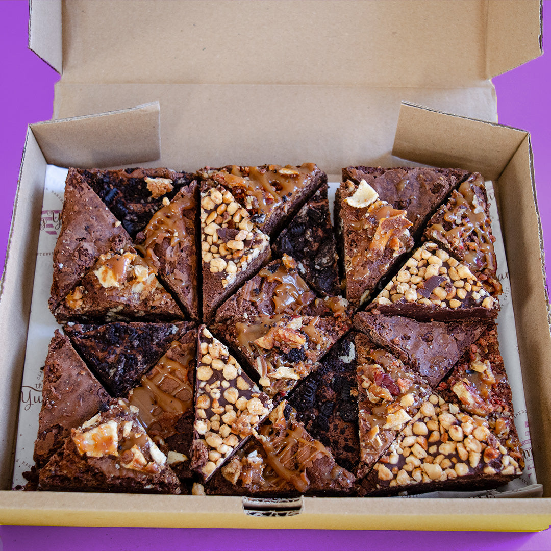 24 pieces of brownie (bigger than) bites in 6 awesome flavours: Heaven Sent Brownie, Sea Salted Caramel Brownie, Oreo Brownie, Drunken Pig in the Mud Brownie, Peanut Butter Brownie and New Yorker Brownie. Includes packing and first class signed for delivery. Contains nuts. DHL UK delivery included in price.